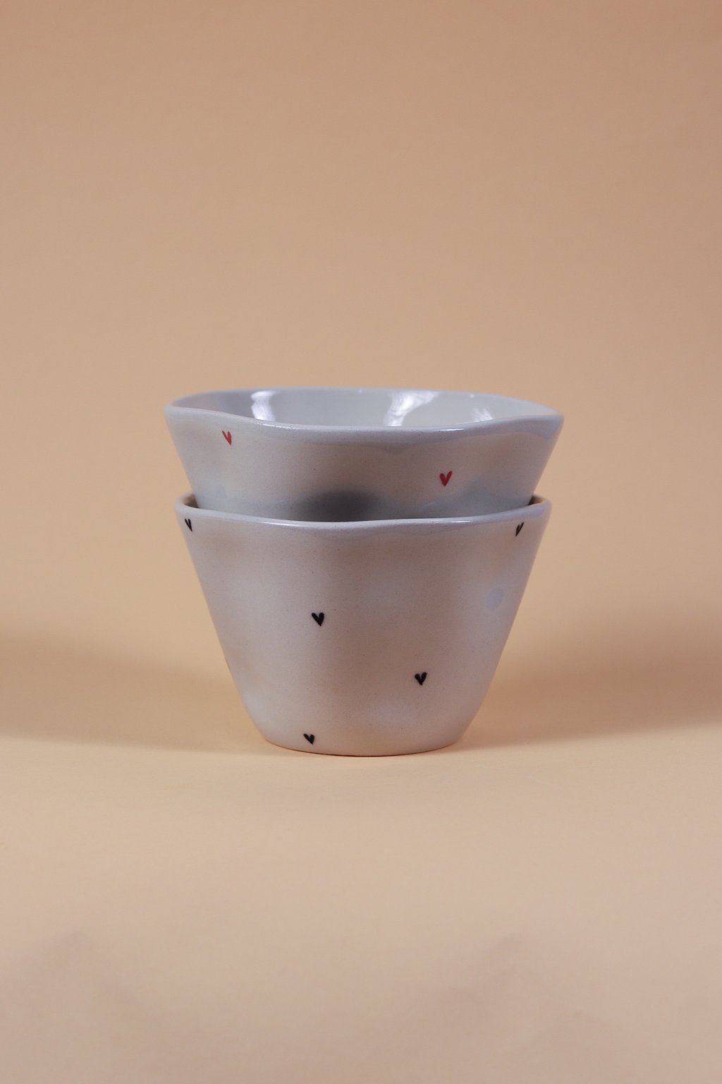Šířka misky je cca 11 cm a výška cca 7 cm. Každé srdíčko je ručně nakreslené.