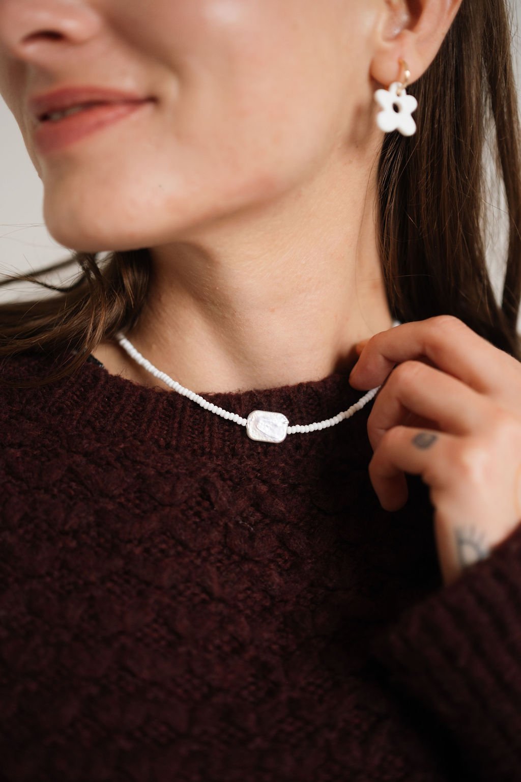Ručně navlékaný z drobných bílých korálků, které vytvářejí jemnou a čistou linii.