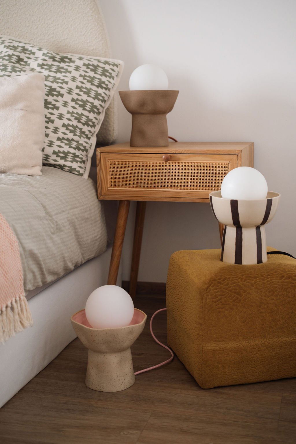 Keramická lampička je dodávána s designovým kabelem s vypínačem a kulatou matně bílou žárovkou.